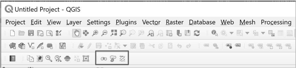 · 菜单栏(Menu):几乎QGIS所有的功能都可以在菜单栏找到,包括项目(Project)、编辑(Edit)、视图(View)、图层(Layer)、设置(Settings)、插件(Plugins)、矢量(Vector)、栅格(Raster)、数据库(Database)、网络(Web)、网孔(Mesh)、处理(Processing)、帮助(Help)等菜单。