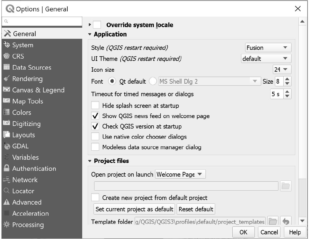 Options…”,即可打开QGIS设置选项对话框(见图2-23),在此可以进行QGIS软件的全局设置。