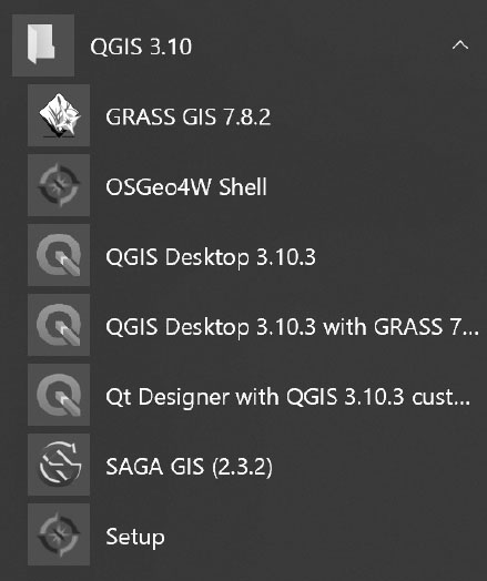 在Windows系统中安装好QGIS以后,可以在“开始”菜单找到QGIS 3.10目录,如图2-15所示,各个快捷方式的功能如下: