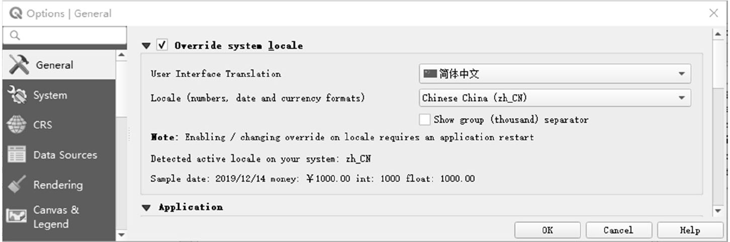 (1)在QGIS菜单栏选择“Settings”—“Options…”命令,打开QGIS语言设置对话框(见图2-17)。