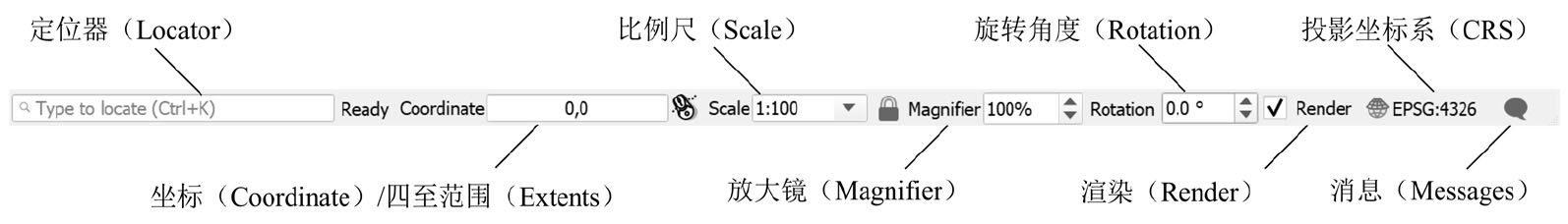 状态栏是QGIS窗口底部的显示组件,包括QGIS各种功能的快速入口,以及操作地图画布等功能(见图2-19)。
