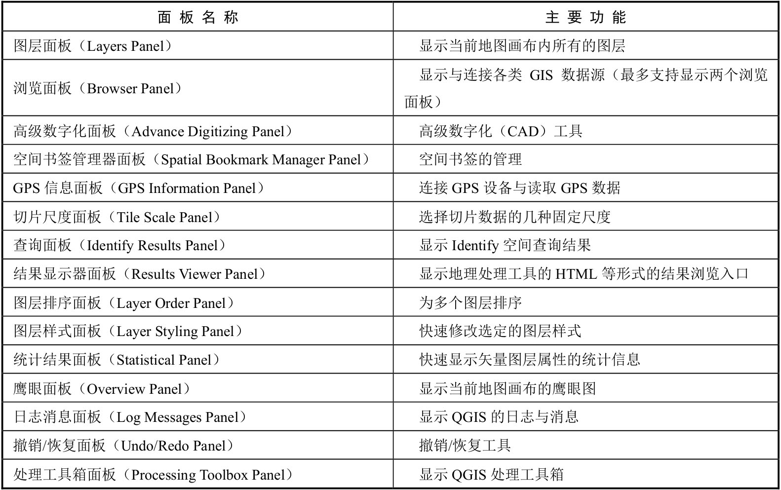 表2-4 QGIS的面板及其功能