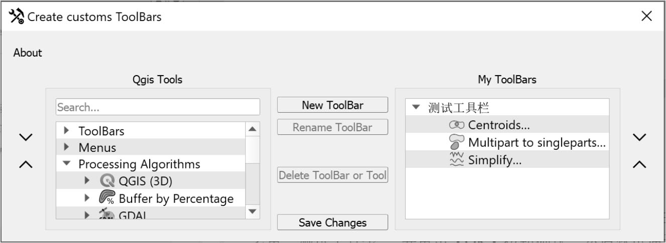 单击“Save Changes”按钮保存更改,在QGIS主界面上方弹出消息“Info: Save correctly.”则说明保存成功。此时,在QGIS的主界面即可使用创建的工具栏(见图2-26)。