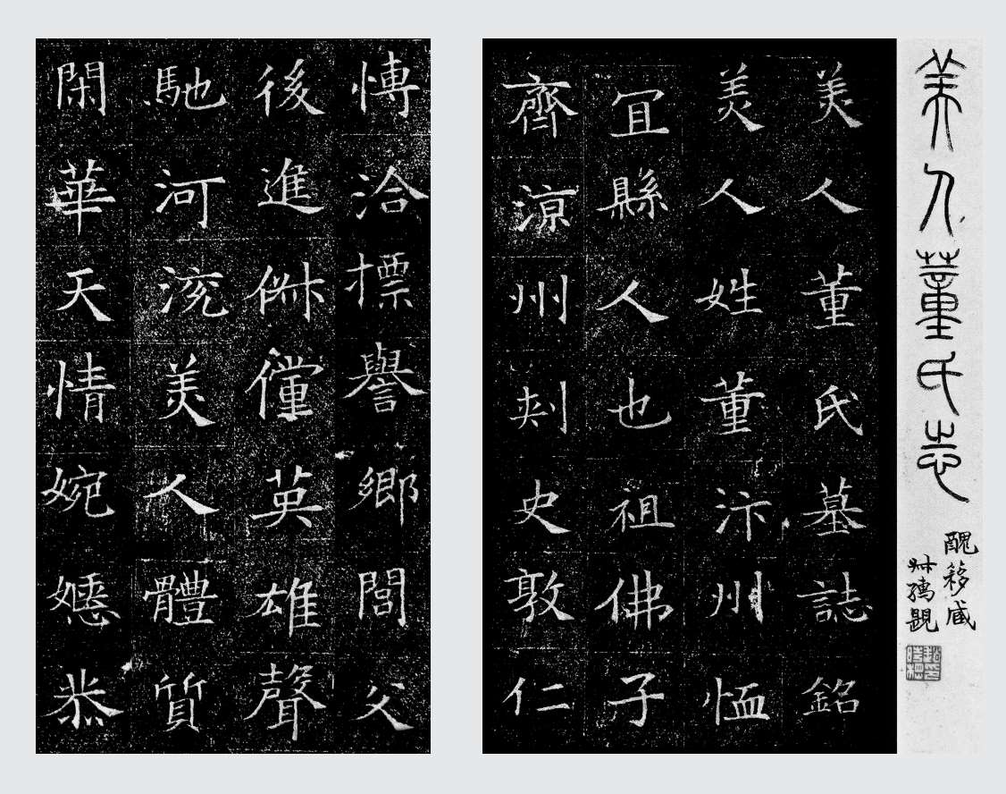 墓志撰寫完畢并交付(往往是長途遞送)給請托者後,墓主家庭可以直接采用撰志者的書法,也可以再請一個書法家謄寫以增添墓志的藝術效果。許多家庭最後選擇另請書法家,這又要花費大量時間和資金。正因爲如此,墓志銘以及墓志拓本爲我們研究書法以及字體的發展演變提供了極有價值的材料。一般來説,墓志銘是用楷書書寫的,而志蓋上死者的姓名和官銜則采用篆書或隸書,然後由當地的刻石藝匠完成最後一道程序。可以想象,在複製這些書法家的作品時,藝匠的審美取向和文化程度對墓志的視覺效果有着極大的影響。正如我們在一些出土墓志中所看到的,書法家或刻石藝匠偶爾會出錯—或是漏字,或是有錯别字。
