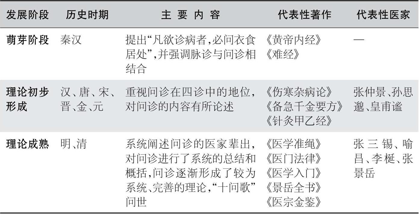 至明清时,问诊的发展日趋成熟,系统阐述问诊的医家辈出,许多医家在总结前人经验的基础上,对问诊进行了系统的总结和概括,问诊逐渐形成了较为系统、完善的理论。如明代张三锡《医学准绳六要》言“凡诊病,必先问所看何人,或男或女,或老或幼,或婢妾,或童仆。次问得病之日,受病之原,及饮食胃气如何,便利如何,曾服何药,日间何如,夜寐何如”,列出种种情形皆须详问,并重点介绍了患者在就诊时的表现及临床意义,如“问而不答必耳聋”“问而懒言眯头,是中气虚”,等等。又喻昌《医门法律》列“问病论”专篇,征引《素问》《灵枢》有关问诊论述,阐明问诊的临床意义,并在文末附禁律一条,指出一般医生不明问诊易犯的错误。李梴《医学入门》指出“从头至足须详问,证候参差仔细听”,并具体列出所问纲要,指出“凡初证大纲未定,最宜详审,病者不可讳疾忌医,医者必须委曲请问,决无一诊而能悉知其病情也”。