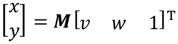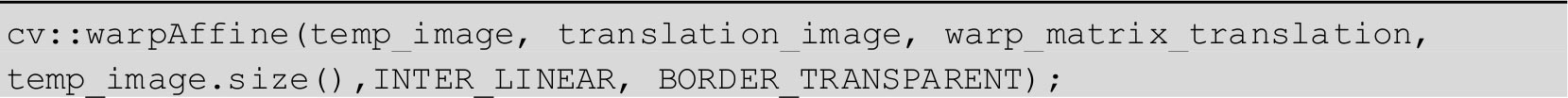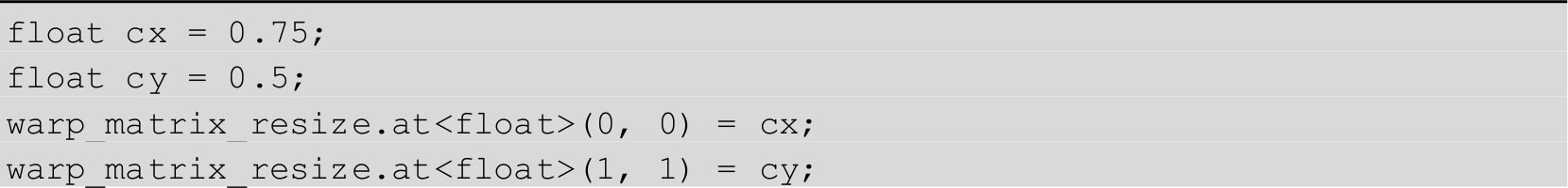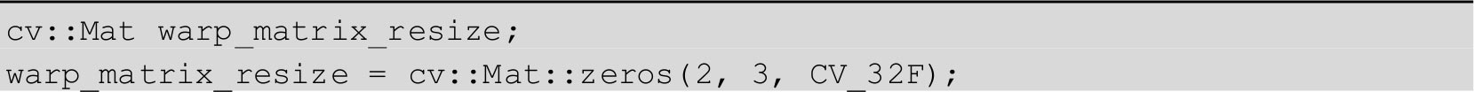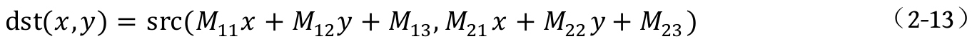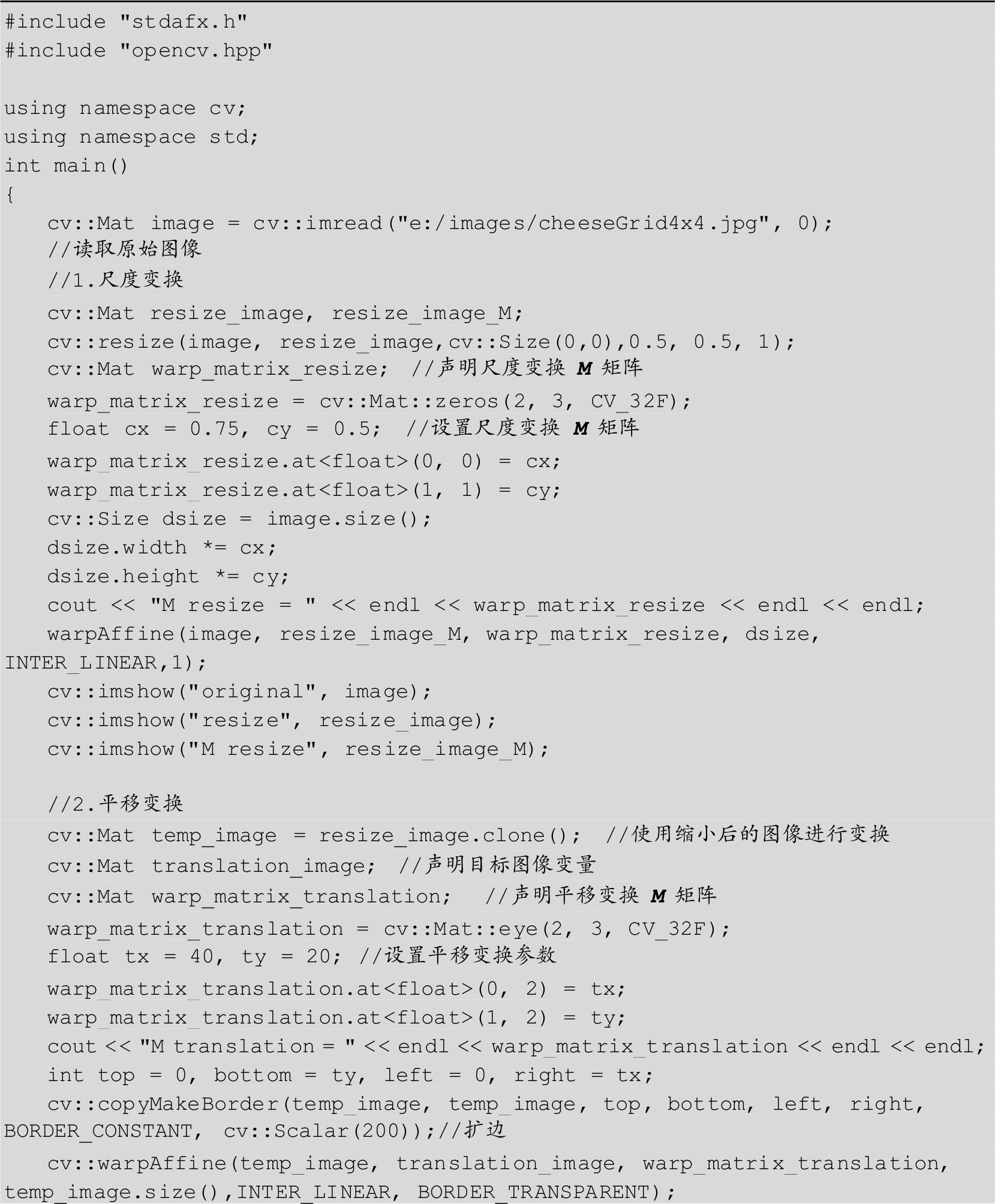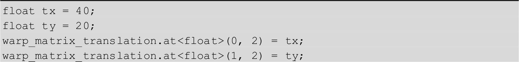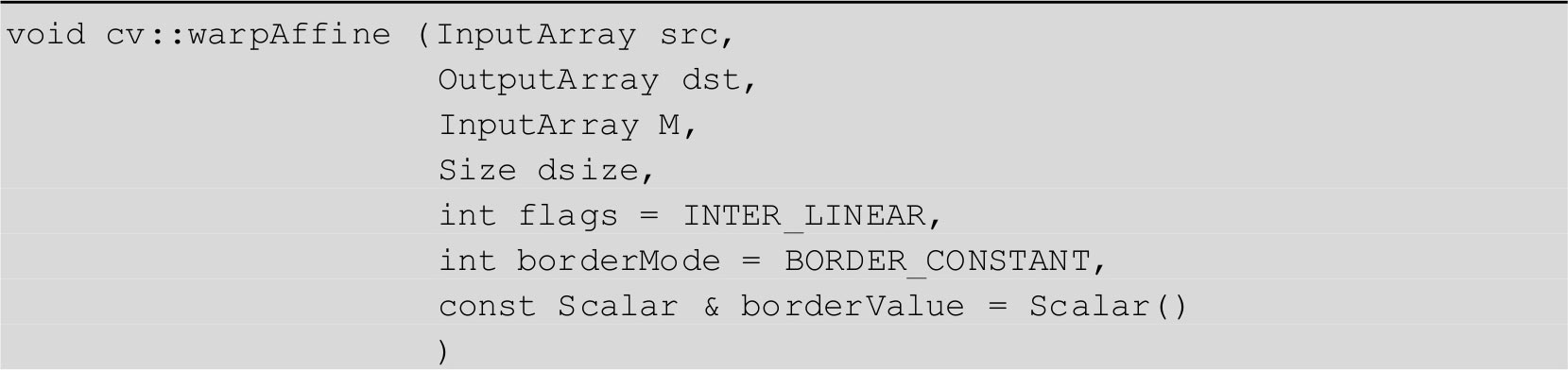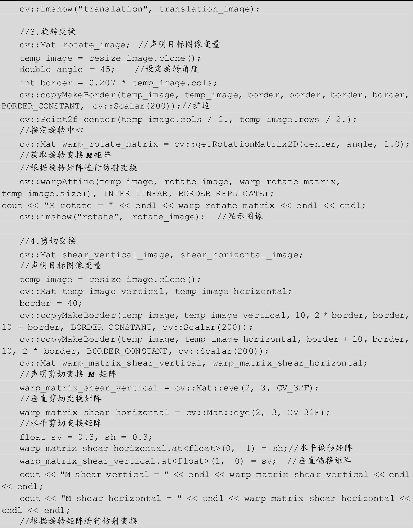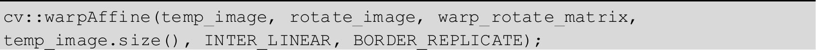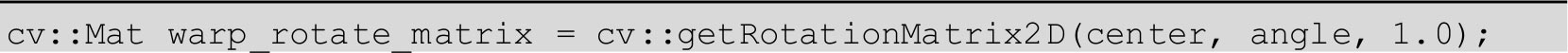 第2步,根据表2-3设置旋转变换 M 矩阵warp_rotate_matrix。OpenCV提供了自动计算旋转变换 M 矩阵的cv::getRotationMatrix2D函数。