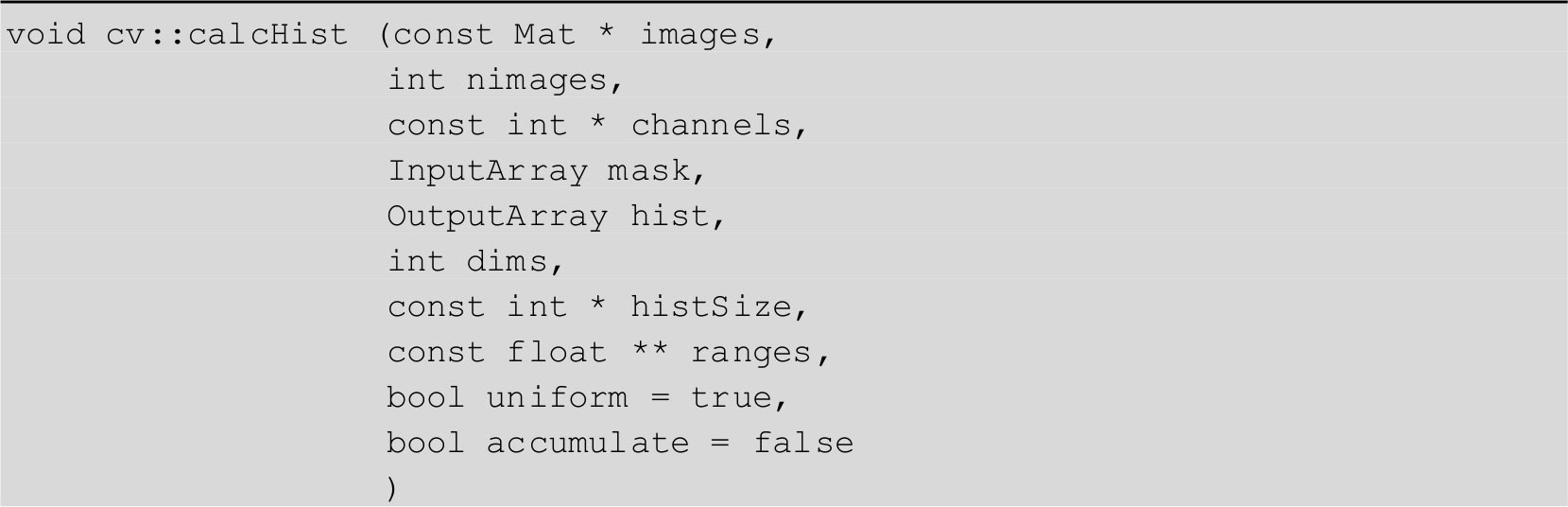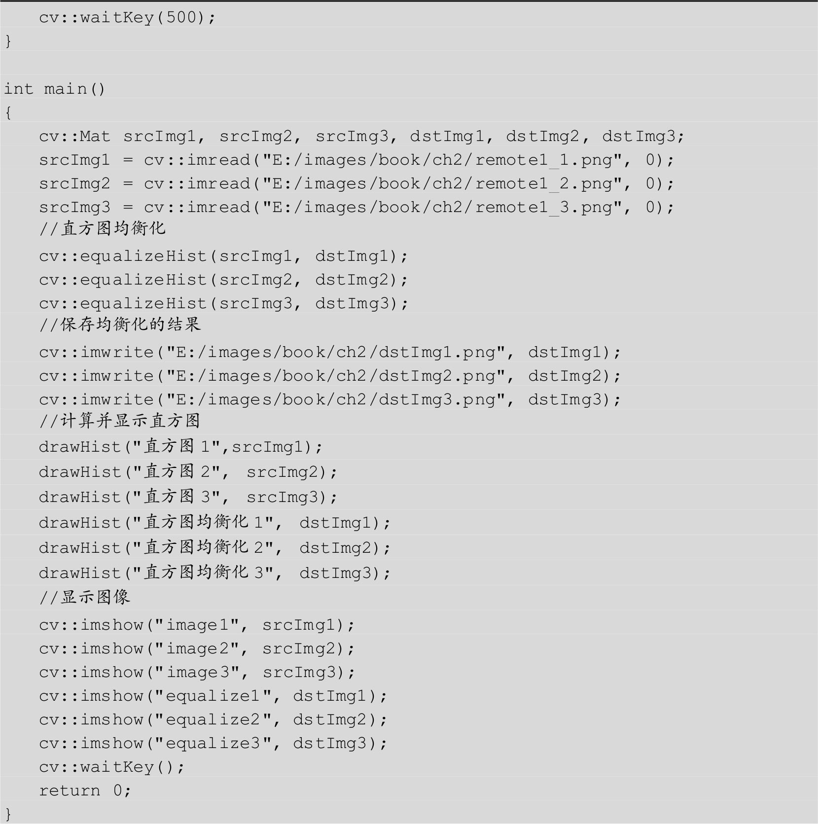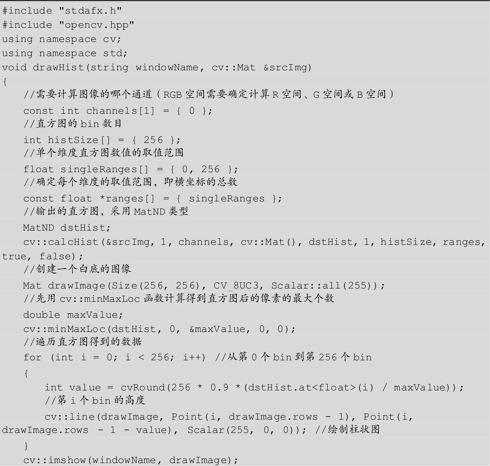 在示例代码2-4中,首先定义一个绘制直方图的函数drawHist (string windowName, cv::Mat&srcImg),两个参数分别为直方图显示窗口的名字与待计算直方图的源图像。该函数计算输入图像的直方图并显示出来,调用的函数为cv::calcHist函数。
