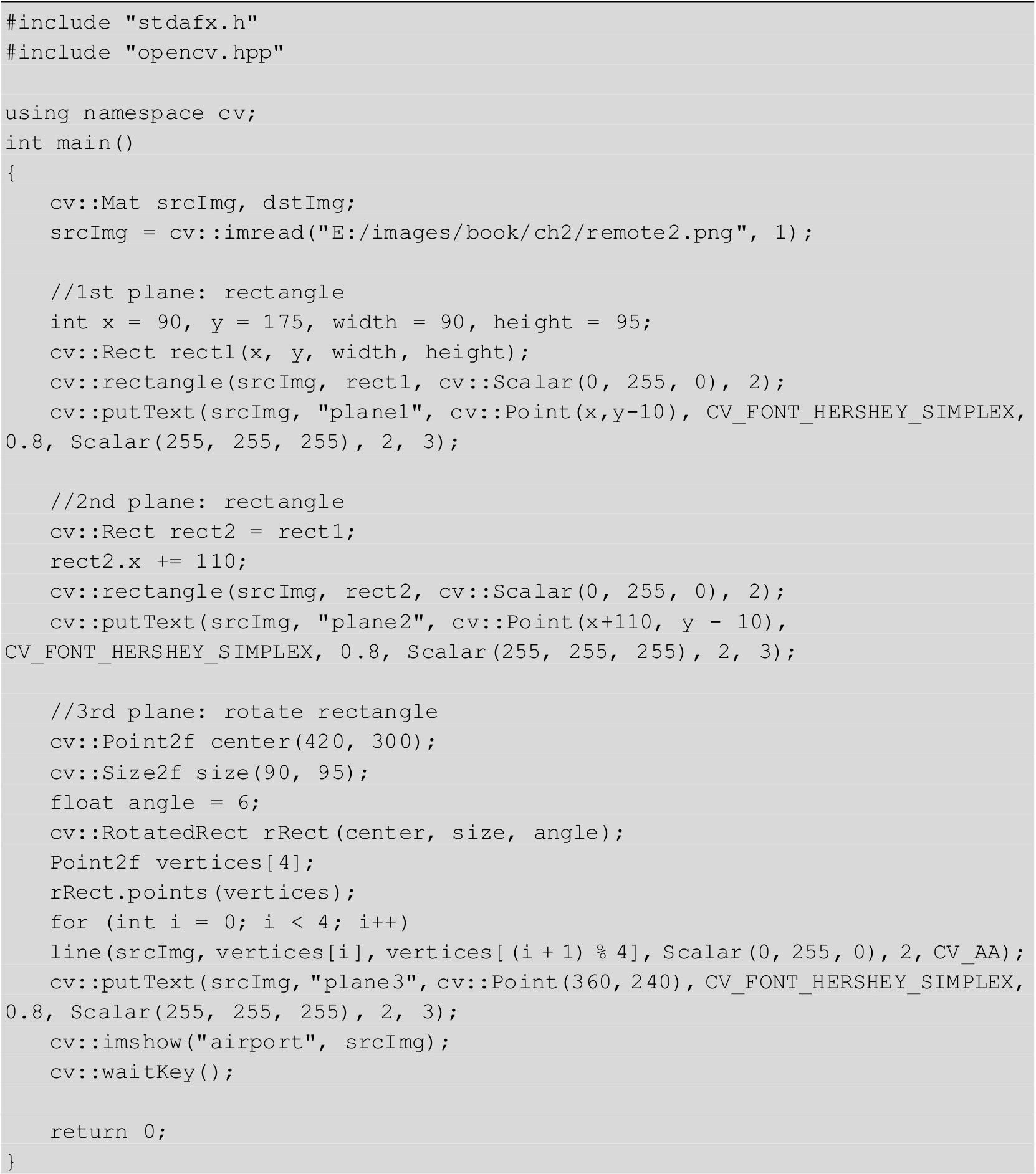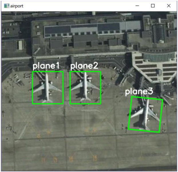 在示例代码2-5中,用矩形框和旋转矩形框对读入的遥感图像中的飞机进行了标注,并添加了文字(目前OpenCV尚不支持中文显示)。其中,cv::putText函数可用来添加文字。