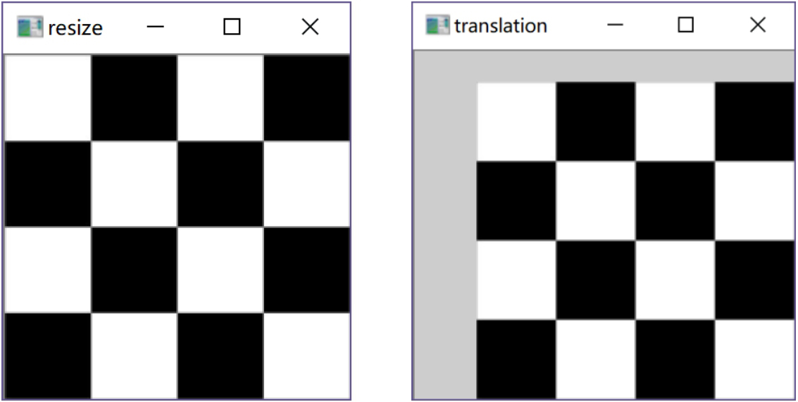 源图如图2-8所示,使用resize函数缩小后的图像如图2-9所示,使用仿射矩阵缩小后的图像如图2-10所示,平移变换如图2-11所示,旋转变换如图2-12所示,垂直剪切变换和水平剪切变换如图2-13所示。