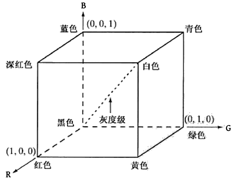 RGB空间基于笛卡儿坐标系,如图2-3所示。图中RGB原色值位于立方体的3个顶点上;二次色青色、深红色和黄色位于另外3个顶点上,黑色位于原点处,白色位于离原点最远的顶点上。立方体中黑色与白色顶点的连线为灰度级,位于灰度级上的彩色值,其RGB各分量相等。