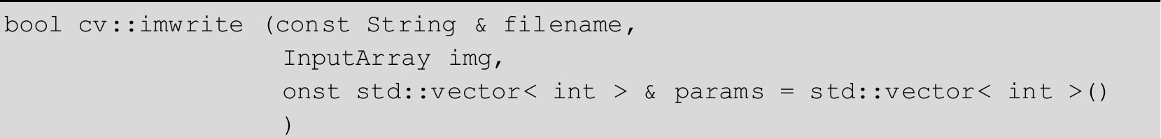 cv::imwrite函数实现了把图像存储为指定格式的文件的功能,存储格式可从文件名的扩展名中获取。当使用此函数将图像保存成.png、.jpeg或.tiff格式的文件时,只有位深度为8位或16位无符号整型数据,且单通道或3通道(通道顺序为BGR)的图像可以。如果图像数据不满足上述要求,则可以使用Mat::convertTo和cv::cvtColor函数把图像转换成可存储的格式。此外,cv::imwrite函数还支持把图像存储为透明图像(.png格式)。