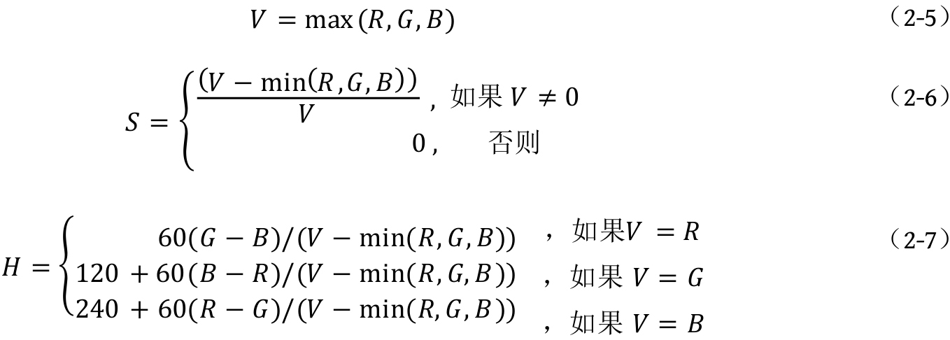 值得注意的是,在OpenCV中可以使用HSV(色调、饱和度和值)空间来隔离图像颜色与亮度信息。RGB空间与HSV空间的转换更为高效,转换公式如下: