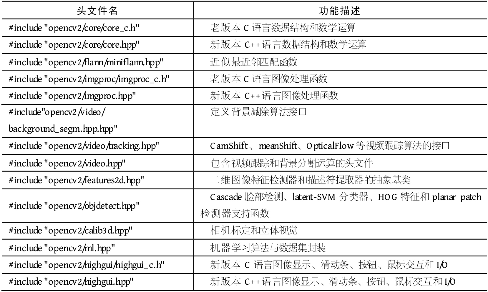 这是OpenCV 3.0及以后版本的头文件引用方式,该头文件包含了OpenCV所有模块的头文件。OpenCV的主要头文件如表2-1所示。只需引用一个头文件即可使用OpenCV里的所有函数与功能。需要注意的是,contrib模块需要单独安装。