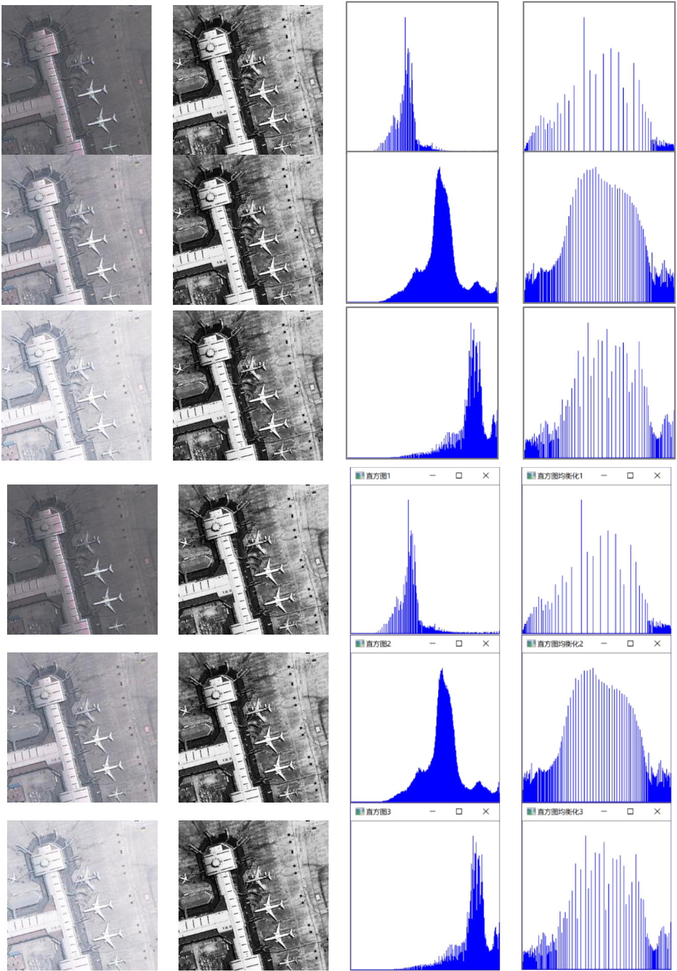 原始图像与直方图均衡化后的图像如图2-16所示,图中第1列为原始图像,第2列为直方图均衡化后的图像,第3列为原始图像的直方图,第4列为直方图均衡化后的图像的直方图。