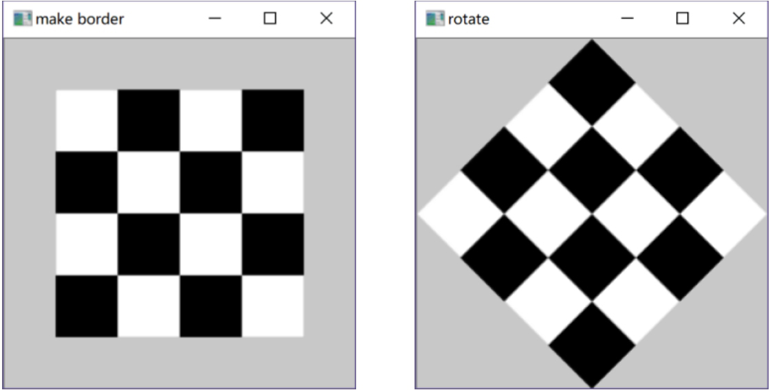 值得指出的是,上面打印的旋转矩阵是旋转中心为图像中心时的数据,加入了平移变换。在OpenCV中,使用cv::getRotationMatrix2D函数获取的旋转矩阵,默认为绕旋转中心逆时针旋转,而上文在描述仿射变换原理时,旋转变换矩阵是绕图像原点顺时针旋转得到的,旋转方向相反,体现在旋转矩阵中就是 M 矩阵中的sin θ 位置的正负号对调了。这里不再赘述,感兴趣的读者可以自己试一试改变后的效果。