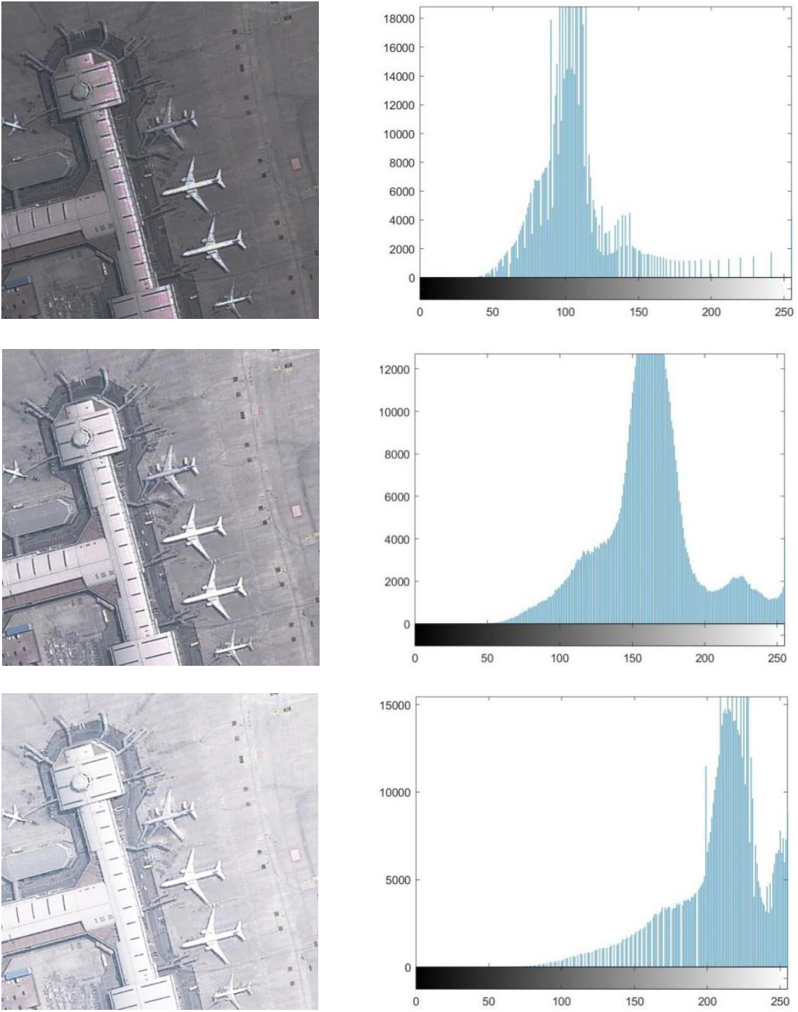 图2-14所示为某机场遥感图像在偏暗、正常和偏亮时的直方图。偏暗的图像直方图像素集中于左侧,偏亮的图像直方图像素集中于右侧,正常图像的直方图像素分布较为均匀。也就是说,如果一幅图像的像素占有全部可能的灰度级并分布均匀,则这样的图像将具有高对比度和多变的灰度色调,从而拥有较好的视觉效果。直方图均衡化就是通过一个变换函数,使输出图像具有上面描述的效果。该函数仅依靠输入图像的直方图即可自动完成对输入图像的变换。