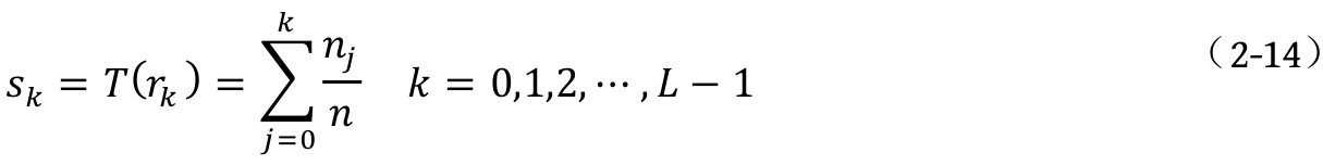 式(2-14)可将输入图像中灰度级为 r k 的各像素映射到输出图像中为灰度级为 s k 的各像素。 n 为图像中的像素总和, n k 为输入图像中灰度级为 r k 的像素个数, L 为图像可能的灰度级总数。已知一幅图像,直方图均衡化处理只需要执行式(2-14)即可,该式是从已知图像中提取信息,不需要额外的参数。这一特点使得直方图均衡化操作变得简单实用。