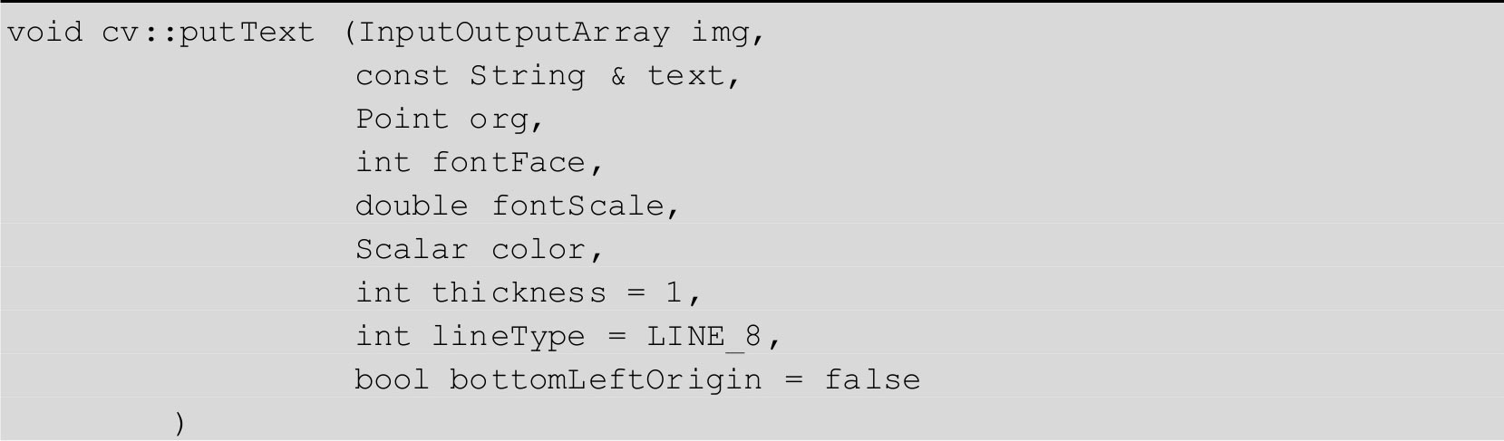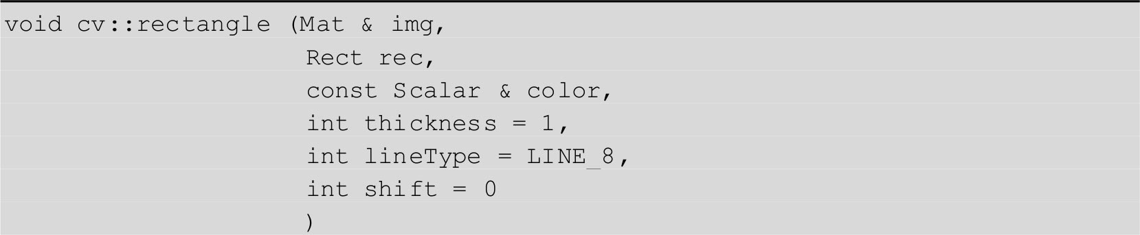 在机器学习检测、识别等任务中,通常需要在图像中将计算结果标注出来。OpenCV不仅提供了在图像上添加文字的cv::putText函数,还提供了多个图形绘制函数,用于标注图像中特定位置和大小的物体。例如,cv::circle函数、cv::ellipse函数、cv::rectangle函数和cv::line函数分别可以绘制圆形、椭圆形、矩形框和直线。其中,最常用的是矩形框和直线。示例代码2-5将简要描述如何使用这些函数。