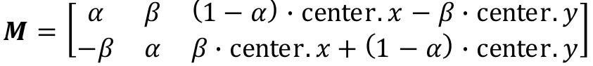 cv::getRotationMatrix2D函数既执行了上述步骤,又集成了尺度变换。下面给出的是该函数对 M 矩阵的计算过程: