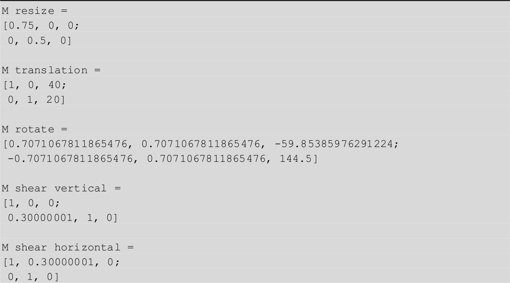 在屏幕上依次打印尺度变换矩阵、平移变换矩阵、旋转变换矩阵、水平剪切变换矩阵和垂直剪切变换矩阵。