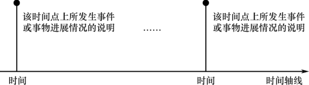 。在数据新闻中,时间轴常用来表达事件或事物随时间发展的过程,其最常见的构成形式如图1-1所示,包含时间轴线、时间点及其标注说明三个要素。例如,澎湃新闻《美数课》栏目在《一图看懂|174天教练生涯落幕,盘点里皮执教中国队战绩》
