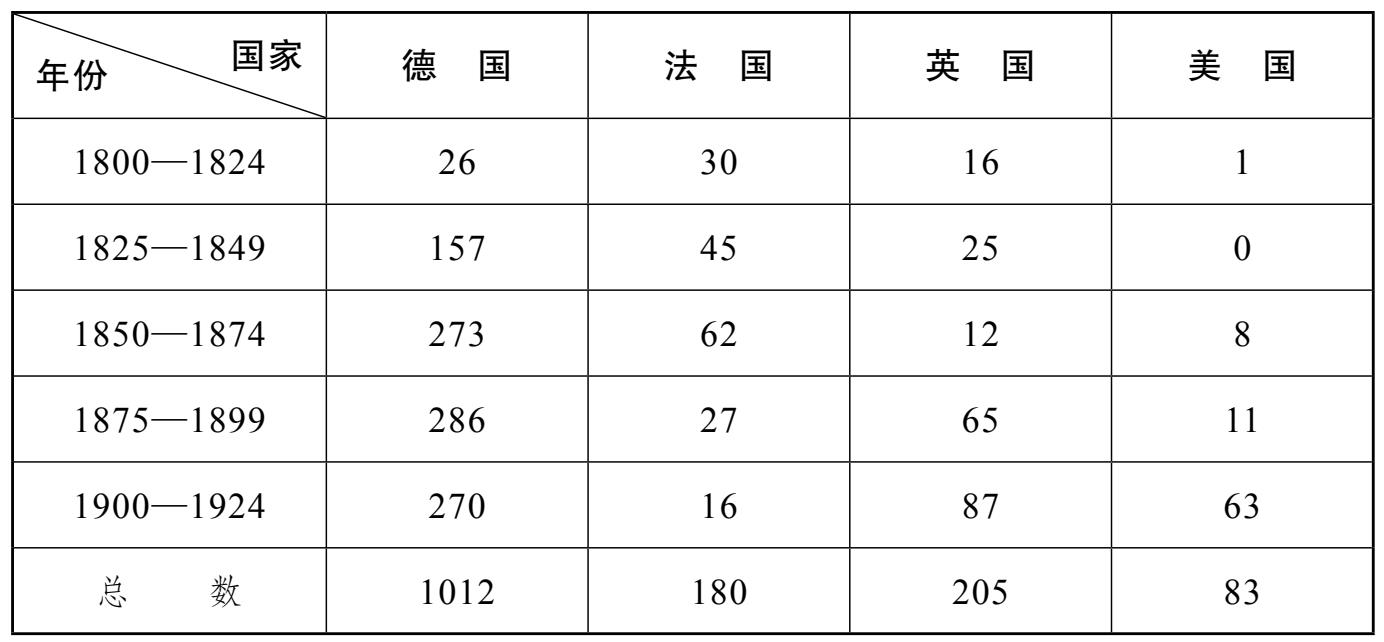 从表中可以轻易看出,法国在19世纪的头二十五年与德国不分轩轾,在接下来的五十年间也继续有所成长,但幅度远不及德国,到了世纪末更出现下降;在1825至1924年的一百年间,德国的生理学研究则独领风骚。英国的生理学研究虽然传统深厚,但在19世纪的前七十五年都大幅落后德法两国,直到19世纪末、20世纪初才奋起直追;至于美国的崛起,更是20世纪以后的事。