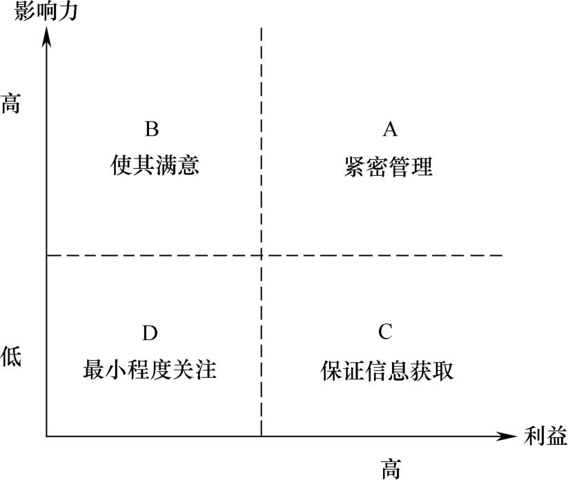 影响力-利益矩阵是利益相关者分析的常用方法,通过对利益相关者进行界定、分类,提供有针对性的管理策略,如图3-1所示。