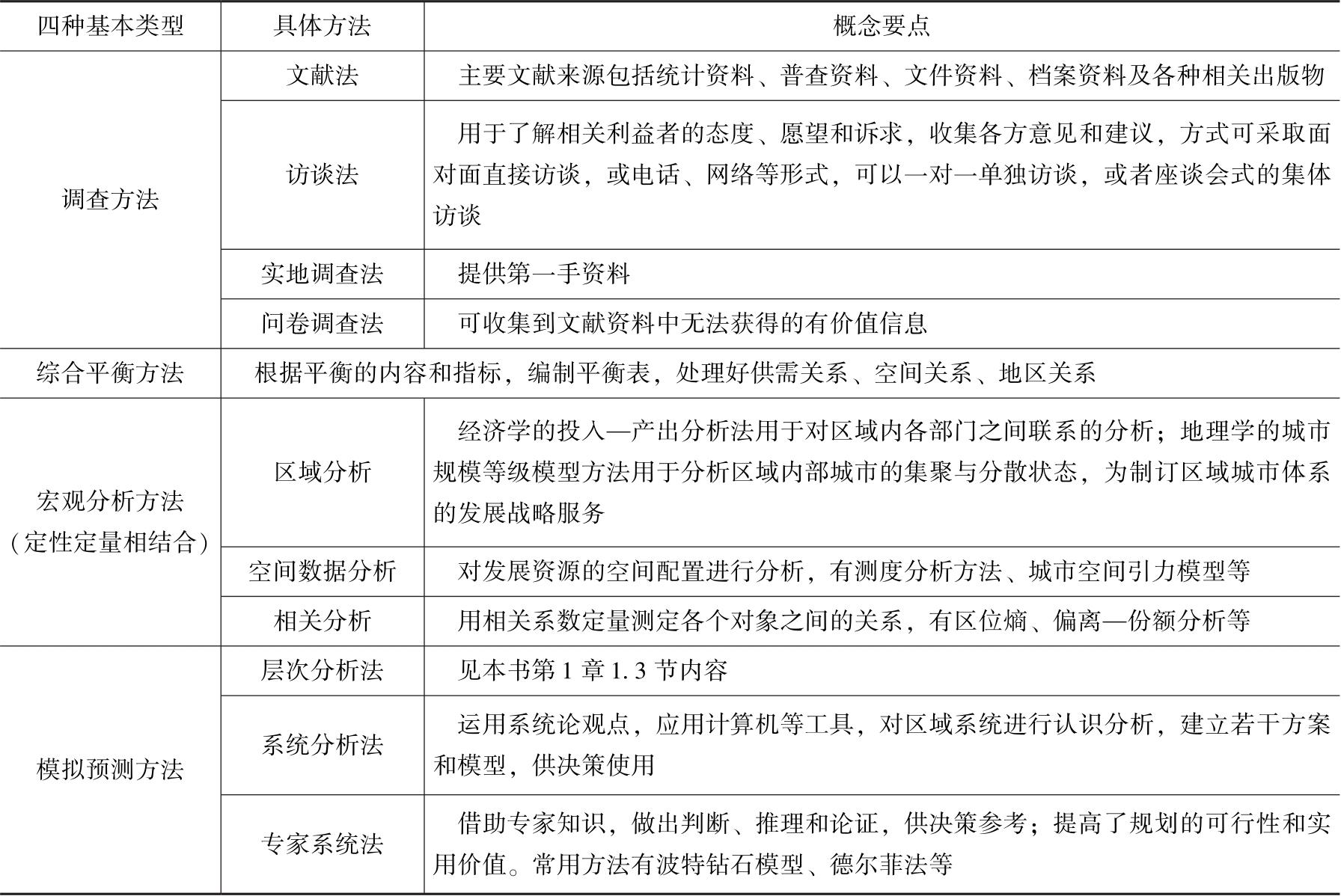 根据规划咨询的过程不同,规划咨询方法分为四种类型,包括调查方法、综合平衡方法、宏观分析方法和模拟预测方法,具体内容见表3-1。