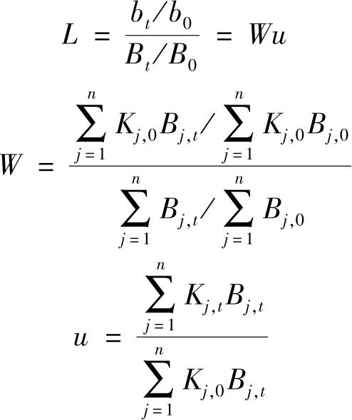 假设区域 i 在[0, t ]一段时期,经济总量和结构发生了变化。设初期区域 i 的经济总规模为 b i ,0 ,末期经济总规模为 b i , t ;区域内有 n 个产业部门,用 b ij ,0 , b ij , t ( j =1,2,…, n )表示区域 i 第 j 个产业部门在初期和末期的经济规模;用 B 0 、 B t 表示所在地区或全国在相应时期初期和末期经济总规模, B j ,0 、 B j , t 表示所在地区或全国初期与末期第 j 个产业部门的规模。