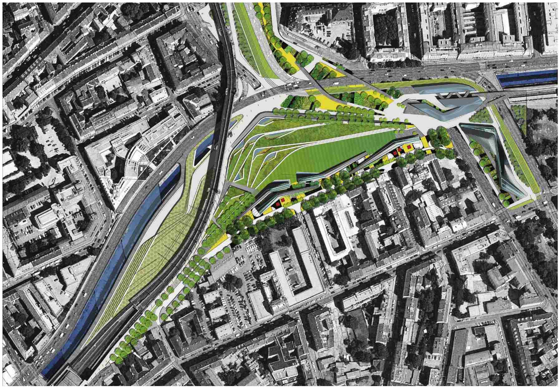 图2.4c 城市草地透视、蒙太奇影像。结合采用GoogleSketchUp和Photoshop处理现有图片。由菲奥娜·基德(FionaKydd)完成。