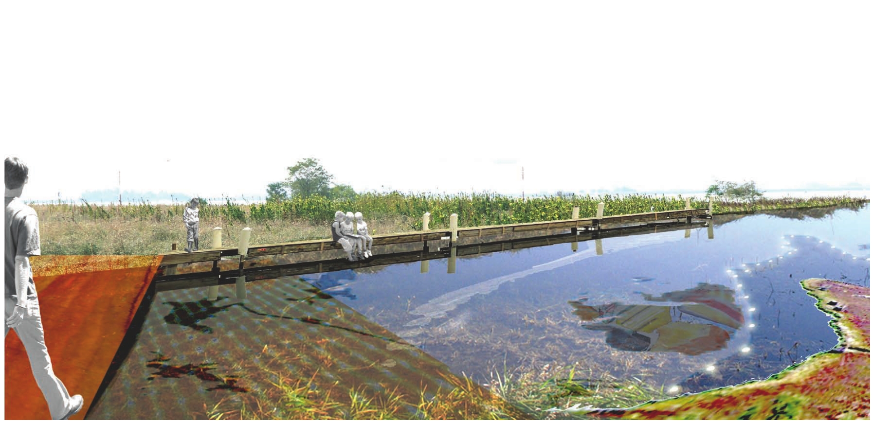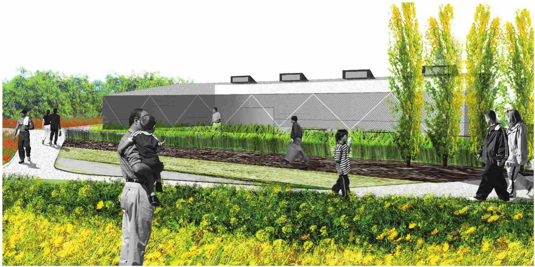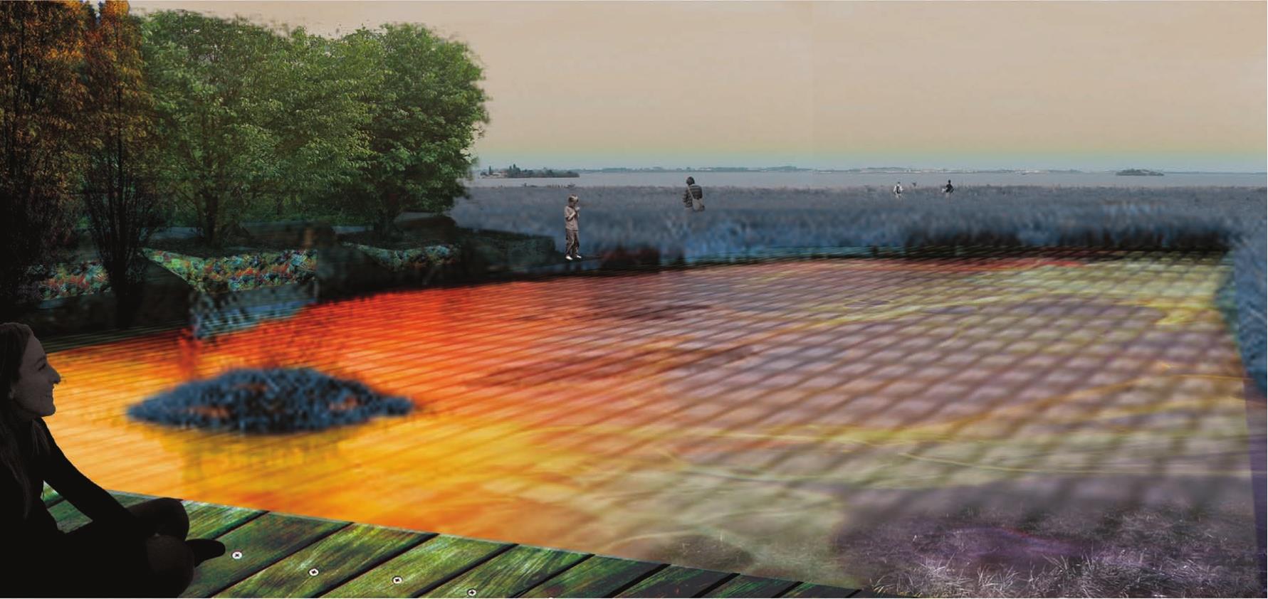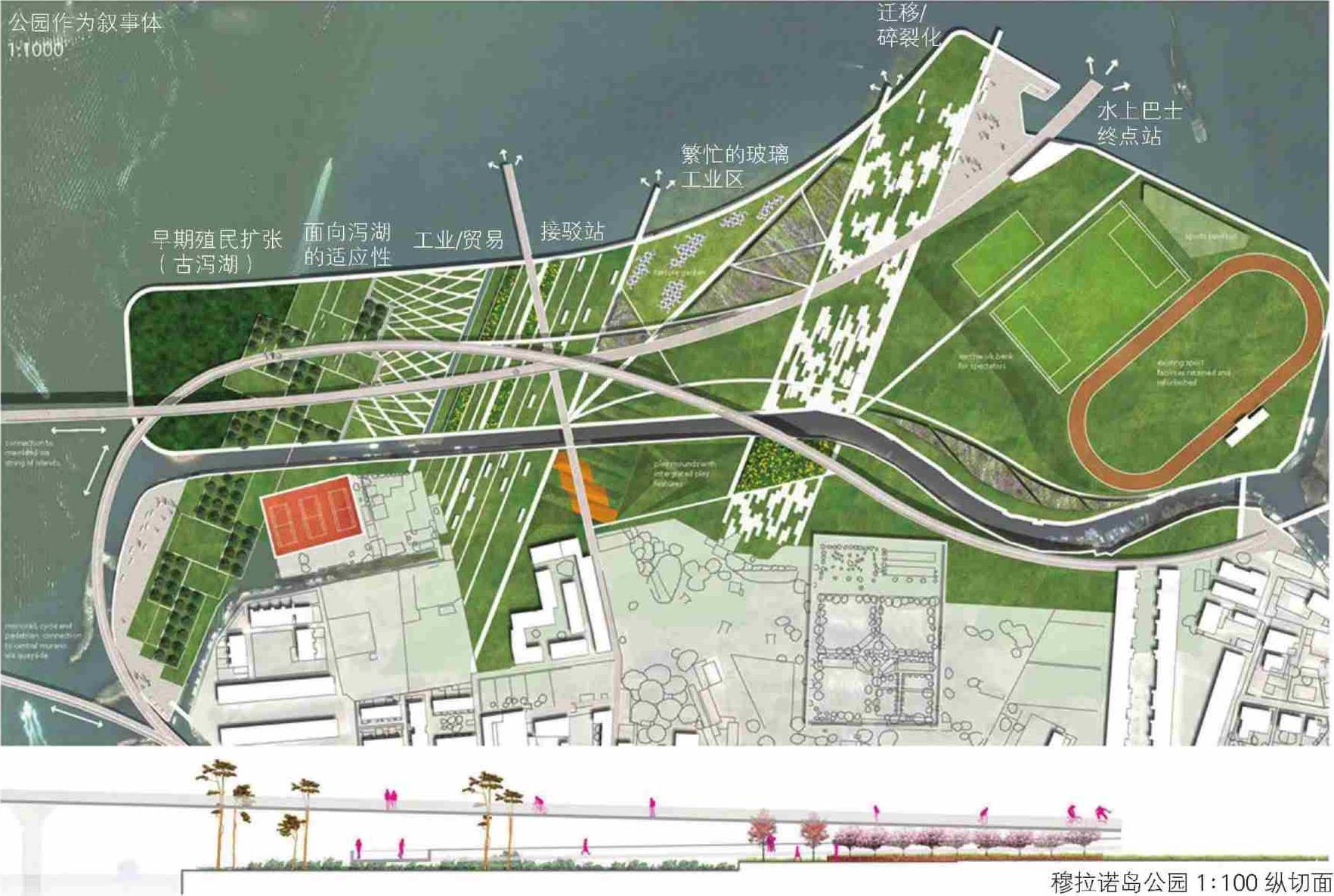图2.2b 穆拉诺岛公园设计。采用了AutoCAD、Photoshop 和手绘进行渲染。由休·巴恩(HughBarne)制作。