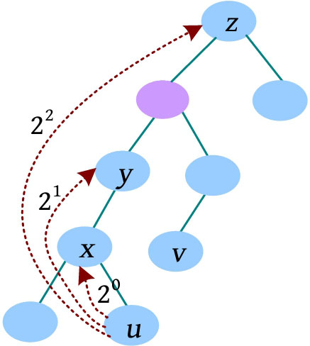 u 节点向上走2 0 步,则为 u 的父节点 x ,F[ u , 0]= x ;向上走2 1 步,到达 y ,F[ u , 1]= y ;向上走2 2 步,到达 z ,F[ u , 2]= z ;向上走2 3 步,节点不存在,令F[ u , 3]=0。