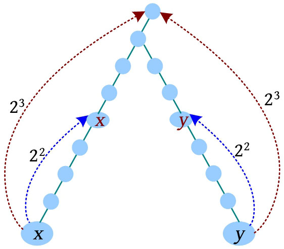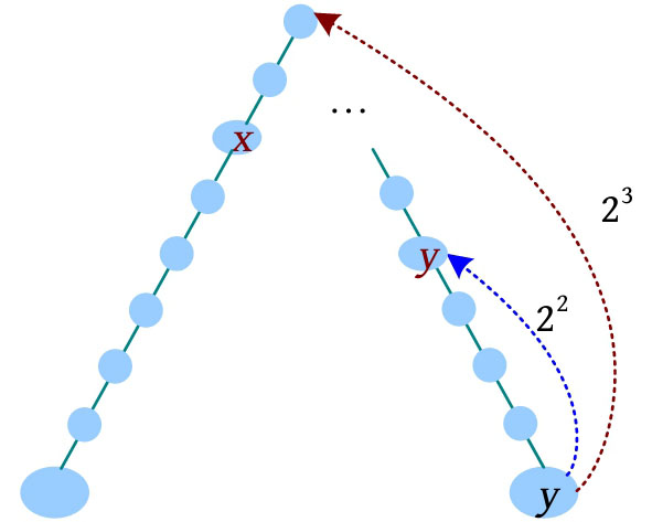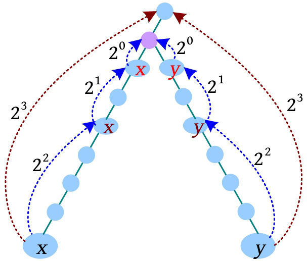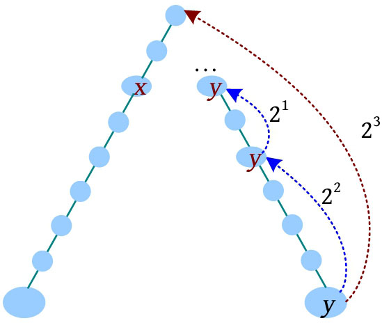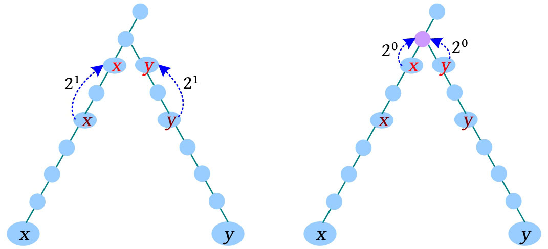 和前面暴力搜索中的同步前进法一样,先让深度大的节点 y 向上走到与 x 同一深度,然后 x、y 一起向上走。和暴力搜索不同的是,向上走是按照倍增思想走的,不是一步一步向上走的,因此速度较快。