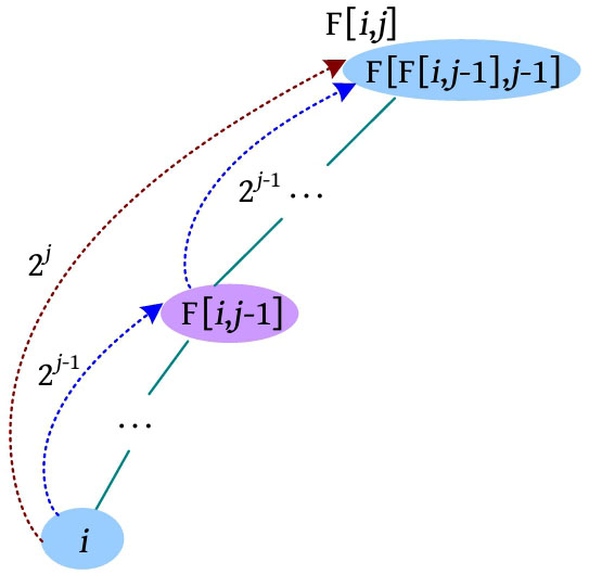 递推公式:F[ i , j ]=F[F[ i , j -1], j -1], i =1, 2, … n , j =0, 1, 2, … k ,2 k ≤ n , k =log 2 n 。