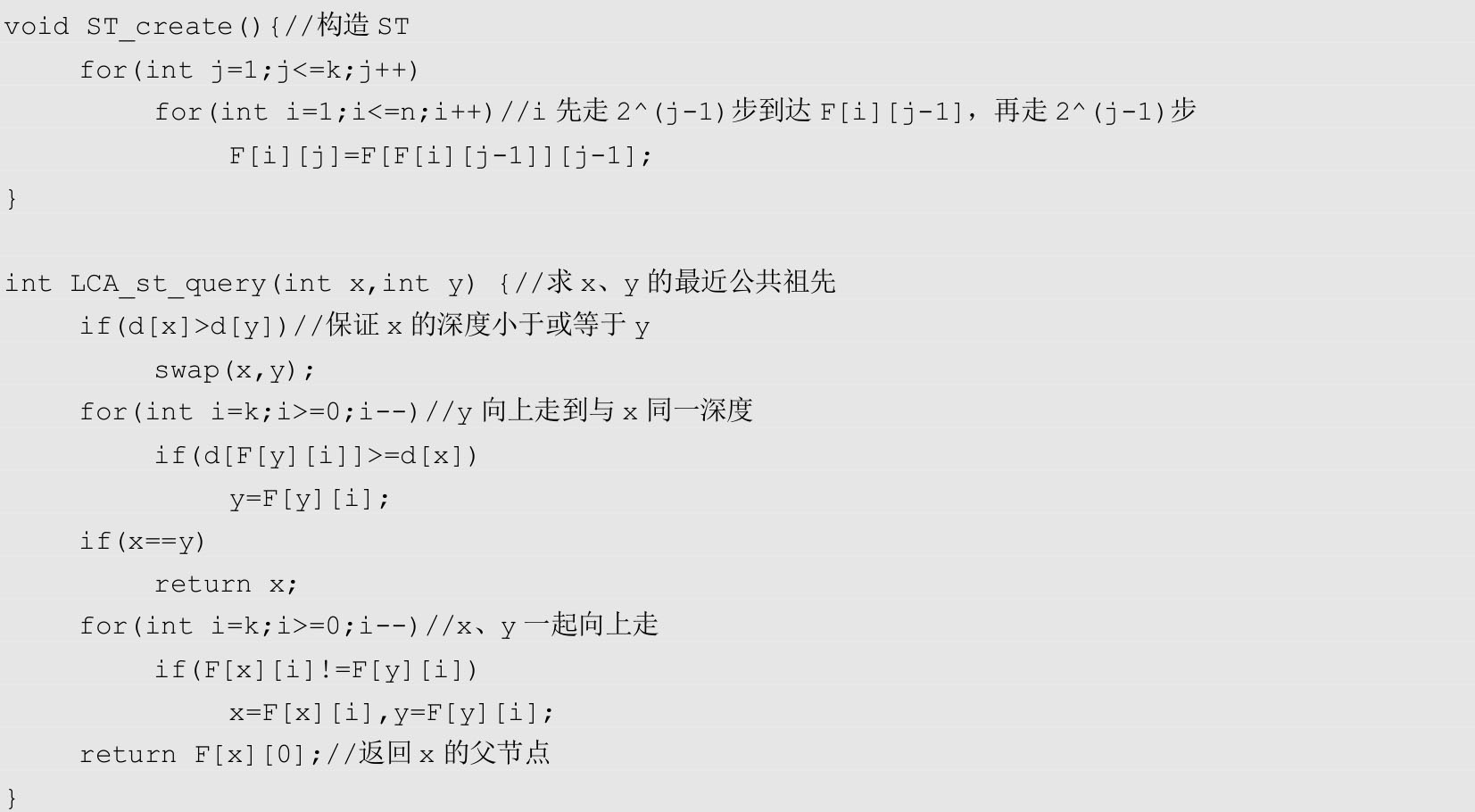 此时 x 、 y 的父节点为最近公共祖先节点,即LCA( x , y )=F[ x ][0]。