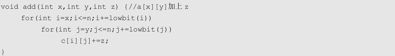 (2)更新。若对 a [ x ][ y ]进行修改(加上 z ),则在一维数组更新的代码中加上一层循环即可。