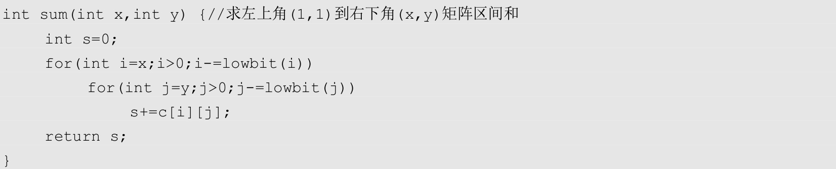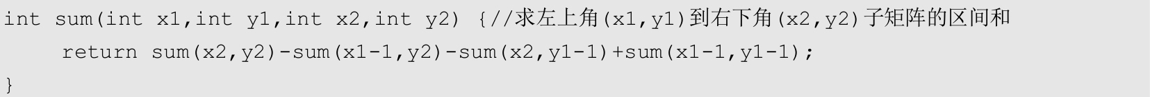 (1)查询前缀和。二维数组的前缀和实际上是从数组左上角到当前位置( x , y )矩阵的区间和,在一维数组查询前缀和的代码中加上一层循环即可。