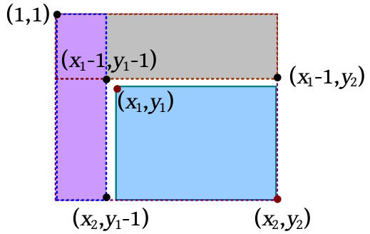 (3)查询区间和值。对二维数组查询区间和,实际上是求从左上角( x 1 , y 1 )到右下角( x 2 , y 2 )子矩阵的区间和。先求出左上角(1, 1)到右下角( x 2 , y 2 )的区间和sum( x 2 , y 2 ),然后减去(1, 1)到( x 1 -1, y 2 )的区间和sum( x 1 -1, y 2 ),再减去(1, 1)到( x 2 , y 1 -1)的区间和sum( x 2 , y 1 -1),因为这两个矩阵的交叉区域多减了一次,所以再加回来,加上(1, 1)到( x 1 -1, y 1 -1)的区间和sum( x 1 -1, y 1 -1)。