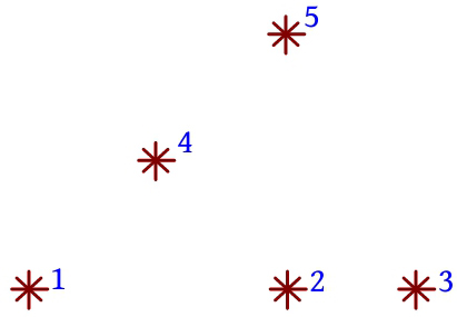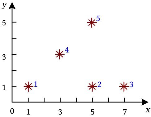 输入样例的地图如下图所示,图中星星旁边的数字为输入顺序,1号星的左下没有星星,等级为0;2号星的左边有1颗星星,等级为1;3号星的左边有2颗星星,等级为2;4号星的左下有1颗星星,等级为1;5号星的左边有3颗星星,等级为3。因此等级为0的有1个,等级为1的有2个,等级为2的有1个,等级为3的有1个,等级为4的有0个。