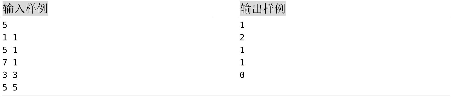 输入: 第1行包含星星的数量 N (1≤ N ≤15000)。以下 N 行描述星星的坐标,每行都包含两个整数 X 、 Y (0≤ X , Y ≤32000)。平面上的一个点只可以有一颗星星。以 Y 坐标升序输入,在 Y 坐标相等时以 X 坐标升序输入。
