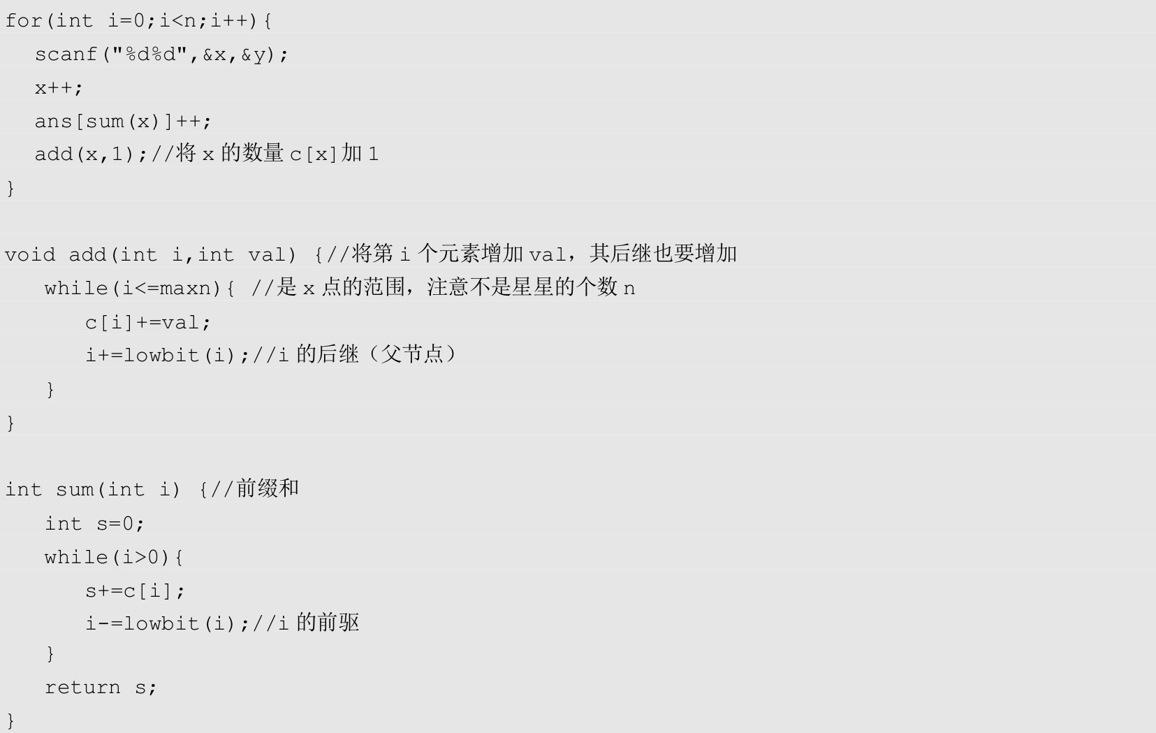 本题看似二维数据,实际上输入数据已经按照 y 升序,也就是说,读到一个点时,当前点的 y 坐标肯定大于或等于已经输入的 y 坐标。如果 y 坐标相等,则 x 坐标肯定大于已经输入的 x 坐标,所以每次只要计算 x 坐标比当前点小的点就行了。该问题的本质是统计 x 坐标前面星星的数量,是前缀和问题。因为数据量较大,暴力穷举会超时,所以可以借助树状数组解决。