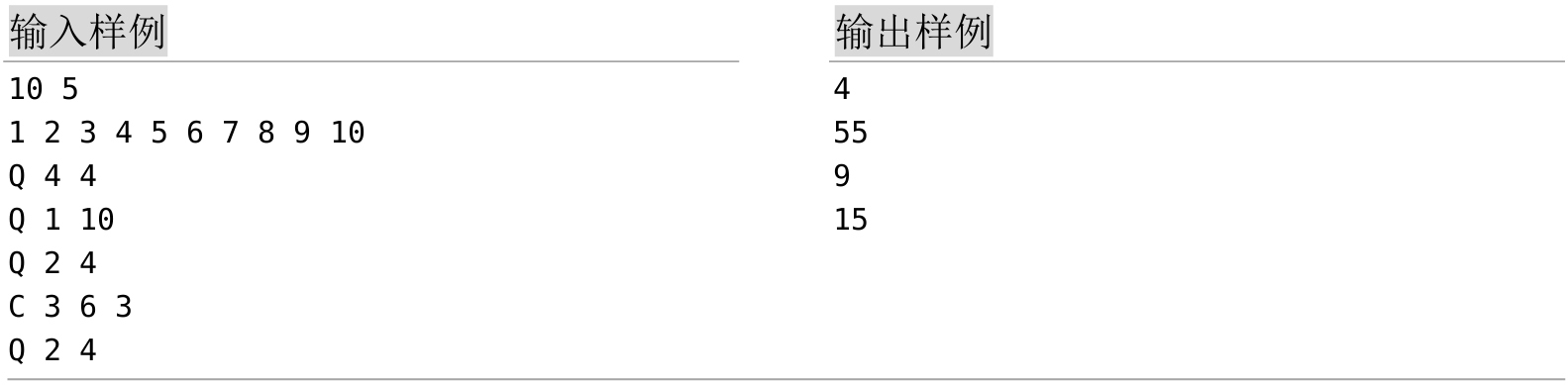 输入: 第1行包含两个数 N 和 Q (1≤ N , Q ≤10 5 );第2行包含 N 个数,为 A 1 , A 2 , …, A N 的初始值(-10 9 ≤ A i ≤10 9 );接下来的 Q 行,每行都表示一种操作,“C a b c ”表示将 A a , A a +1 , …, A b 中的每一个数都加 c (-10 4 ≤ c ≤10 4 ),“Q a b ”表示查询 A a , A a +1 , …, A b 的总和。