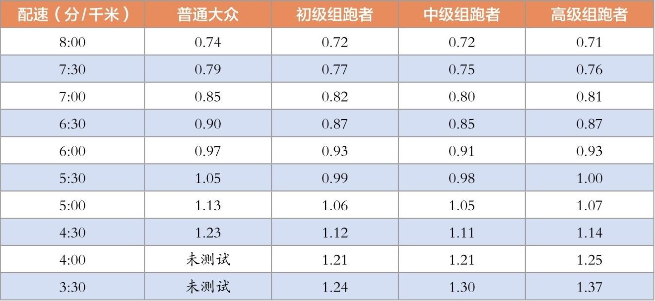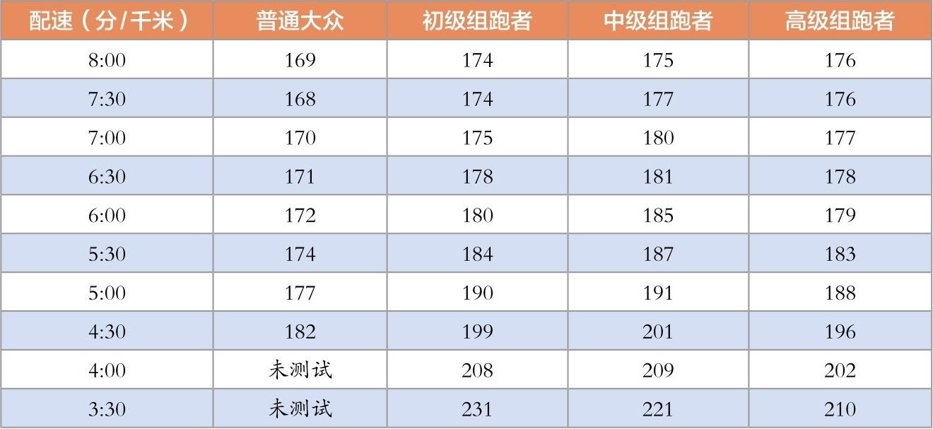 下表及下图显示, 没有跑步经验的普通大众倾向于采用慢步频大步幅的跑姿,经过一定训练的大众跑者,表现为步频有了明显的提升,而经过多年训练的精英跑者,步频在各组中不一定是最快的,其表现为既能够保持足够步频,也能展现比其他跑者更大的步幅。