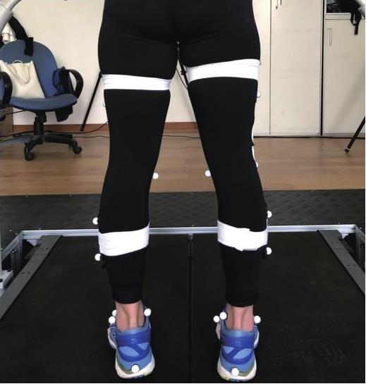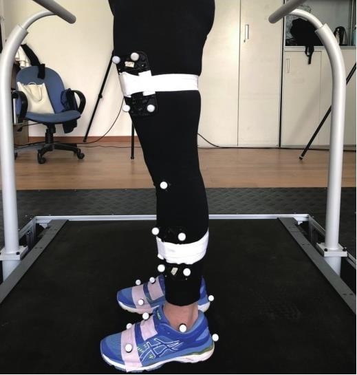 受试者换上无反光标志的紧身服饰,热身10分钟。测试人员调节配速,遵循由慢到快的原则使受试者充分适应测力台,保持平时自然的跑步姿态。根据人体体表骨性标志点,由测试人员对受试者下肢进行从下至上的贴点操作。共计36个反光标志点。