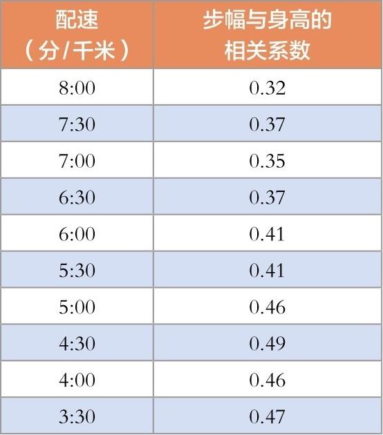 你肯定关心步幅是不是与腿长有关。本研究还做了步幅与身高的相关性研究(见右表),在各个配速下,步幅与身高的相关系数介于0.3~0.5,属于中低度相关。身高越高,一般腿越长。虽然腿长看起来容易实现大步幅,但腿长并不是步幅的决定性因素,身高越高也会带来风阻越大的问题。基普乔盖的身高仅为1.67米,基普乔盖、格布雷西拉西耶等小个子运动员优良的步幅更多与其良好的身体柔韧性、灵活性、肌肉弹性及专项力量有关。