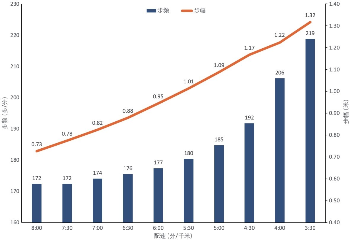 速度越快,一般步频越大,但这不等于速度慢时,步频就允许更慢。本研究显示即使速度慢时,也要努力让步频达到170步/分。当然,当速度足够快时,如进入配速4:30以内,你就要注意加大步幅,加大步幅可能比加快步频更难实现,对身体提出的要求也更高,但如果你想成为高水平跑者,只靠加快步频显然是不够的。