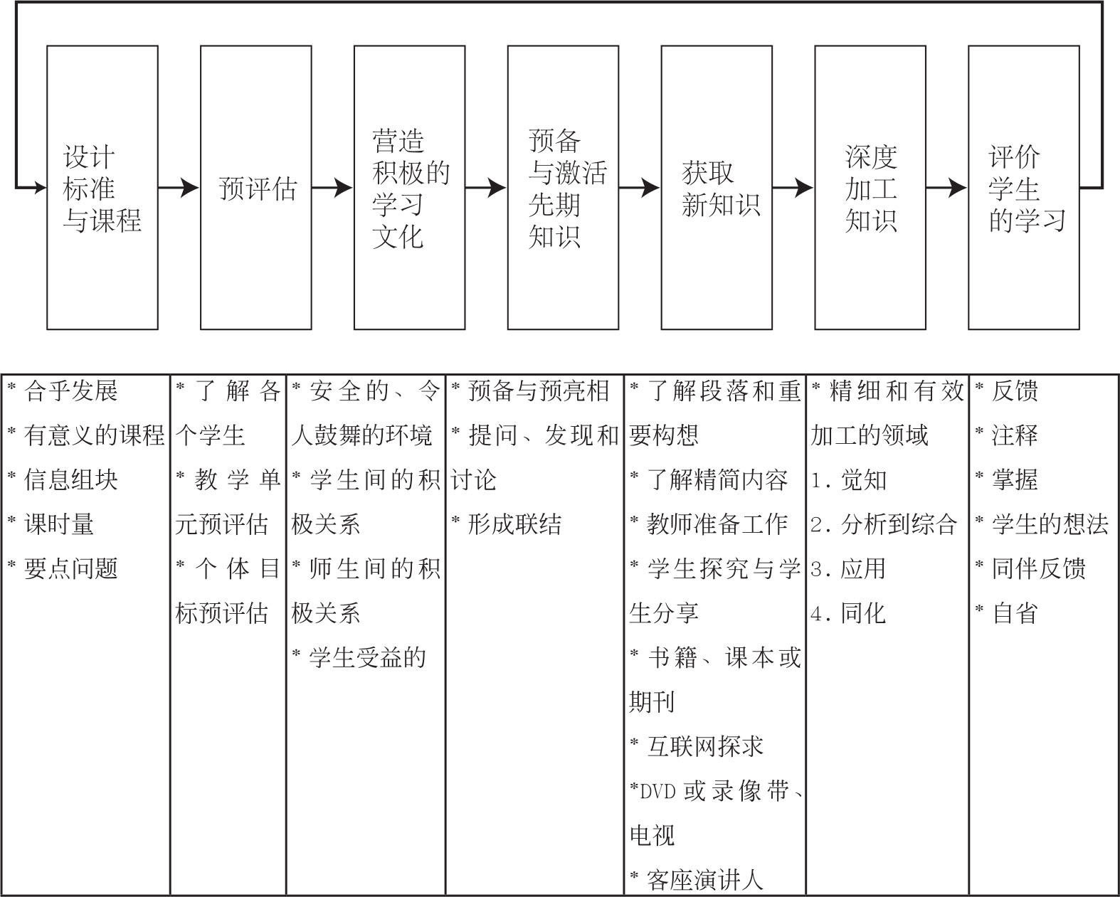 最后,还有研究者提出了促进深度学习的教学模式。詹森(Eric Jensen)和尼克尔森(LeAnn Nickelsen)勾勒出了深度学习路线(Deeper Learning Cycle,简称DELC)。他们的假设是:深度学习是一种复杂的思维活动,而这种复杂思维不可能仅靠学生个体独自生成,它必须依靠教师的外部引导逐步促使学生达到更高水平的学习层次。DELC是一种包含脑研究、标准和个体学习差异在内的教学模式,目的是帮助教师为深度理解和批判性思维而教。DELC共有七个步骤,分别是:设计标准与课程、预评估、营造积极的学习文化、预备与激活先期知识、获取新知识、深度加工知识,以及评价学生的学习(见图1-3)。