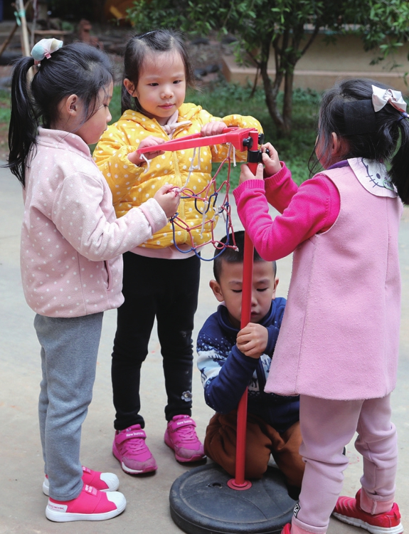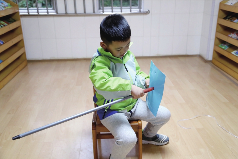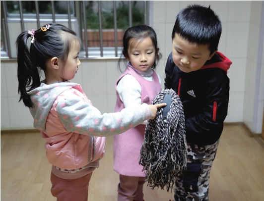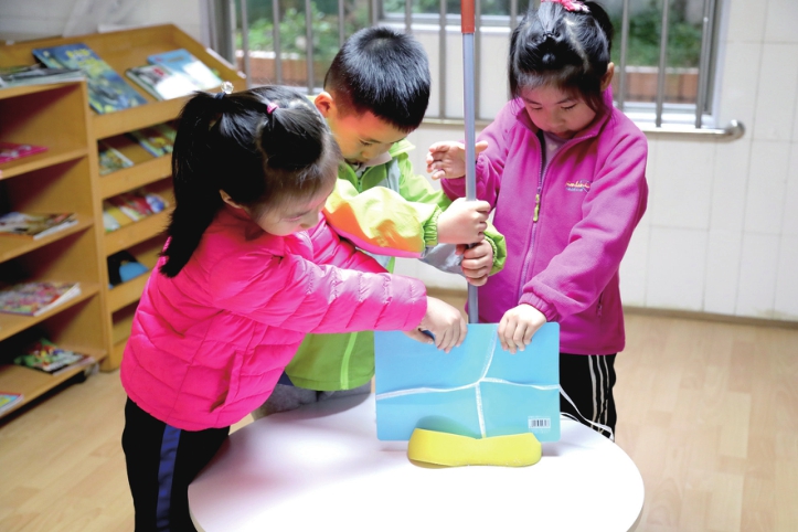 幼儿用绳子连接挤水板和杆子,通过拉动绳子来使挤水板方便升降。