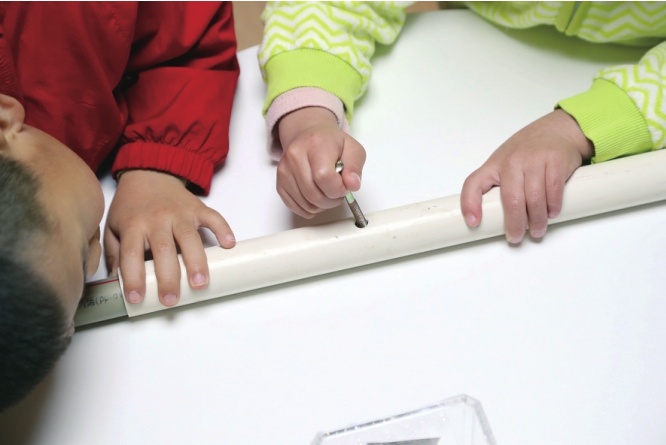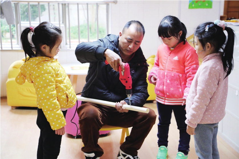 【教师支持: 教师请来王师傅为幼儿提供帮助。王师傅根据幼儿的需要,在塑料板上打洞,并告诉幼儿打洞使用的工具叫电钻,它是专门用来在坚固的东西上打洞的。】