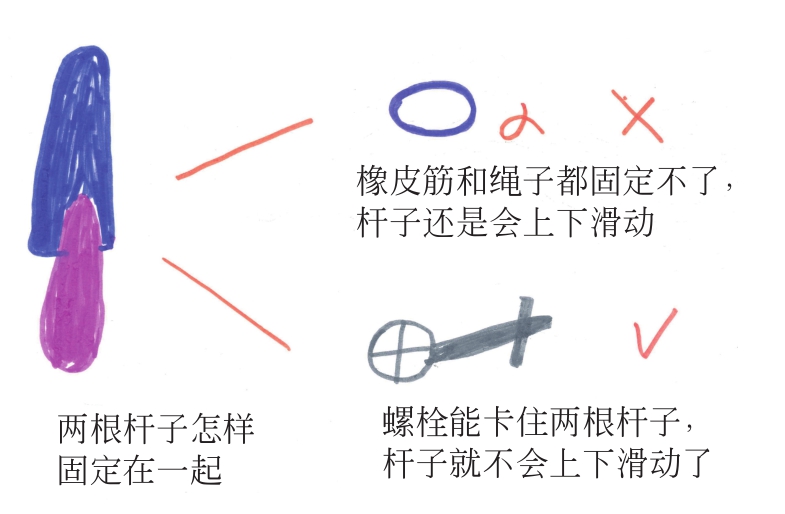 馨予:我们可以用橡皮筋来固定杆子,用绳子也可以。
